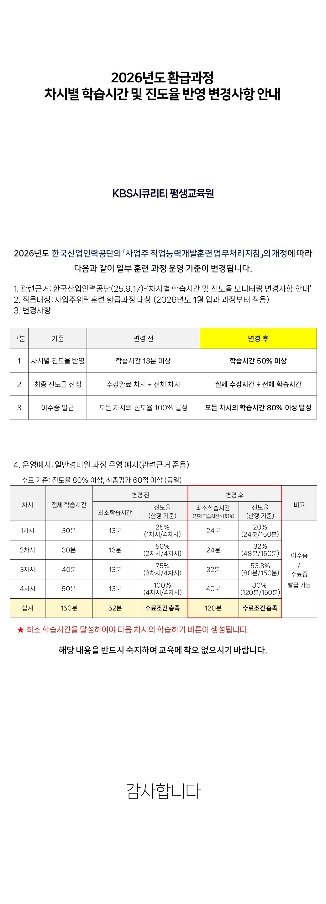 | [주요] [주요/필독] 26년도 환급과정 차시별 학습시간 및 진도율 반영 변경사항 안내 |